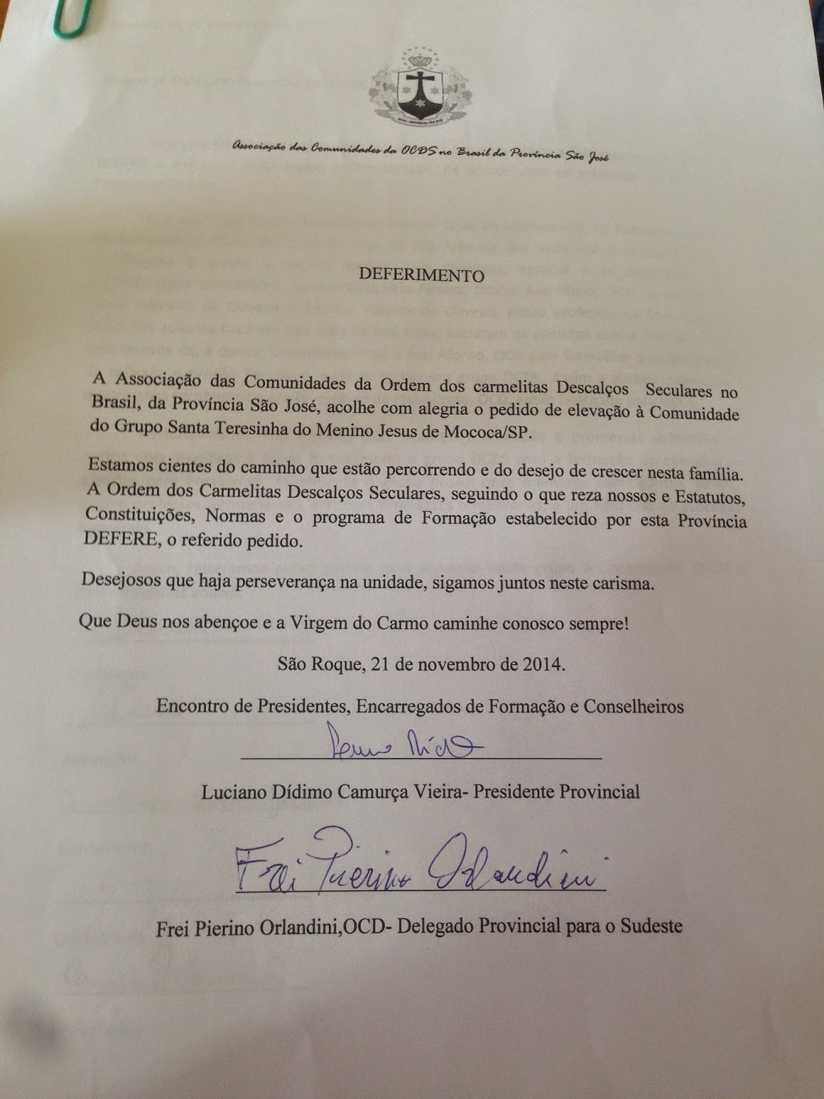 Também foi apresentado por Daniel e Frei Cleber o convite prévio à participarmos do Forum que esta sendo organizado e preparado, para a comemoração dos 500 anos do nascimento de nossa Santa Madre Teresa de Jesus, em Aparecida, o qual será lançado e apresentado mais à frente, com todas as informações necessárias e pertinentes a este grande evento.