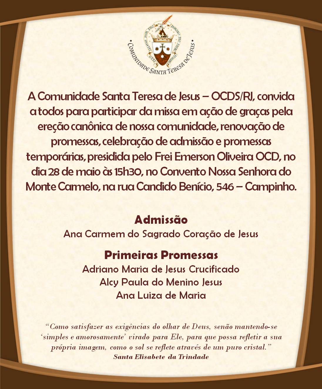 A Comunidade Santa Teresa de Jesus – OCDS/RJ, convida a todos para participar da missa em ação de graças pela Ereção Canônica da Comunidade, renovação de promessas, celebração de admissão e promessas temporárias, presidida pelo Frei Emerson Oliveira, ocd, no dia 28 de maio de às 15:30 h, no Convento Nossa Senhora do Monte Carmelo, na rua Candido Benício, 546 – Campinho.