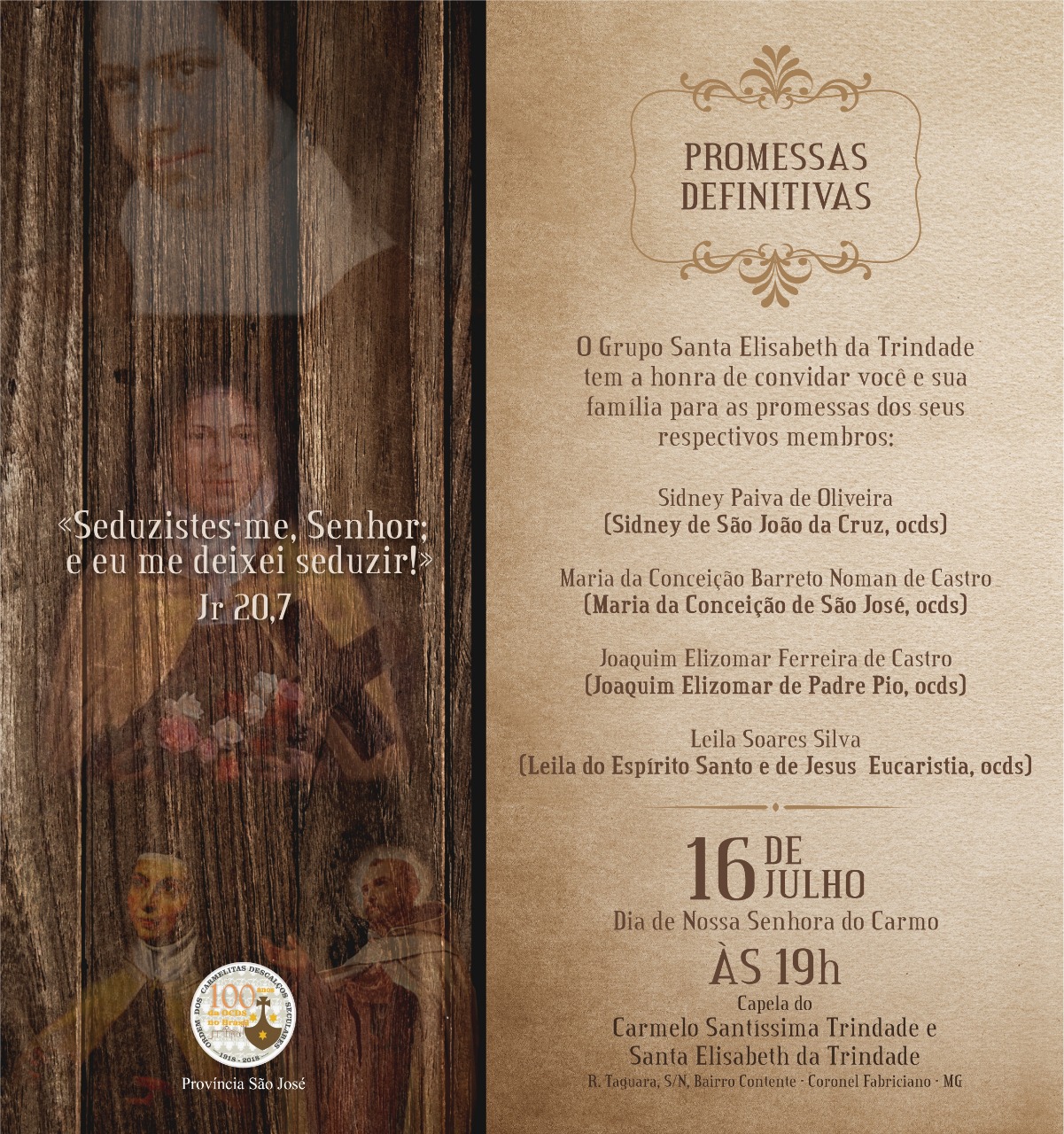 Local: Capela do Carmelo Santíssima Trindade e Santa Elisabeth da Trindade –