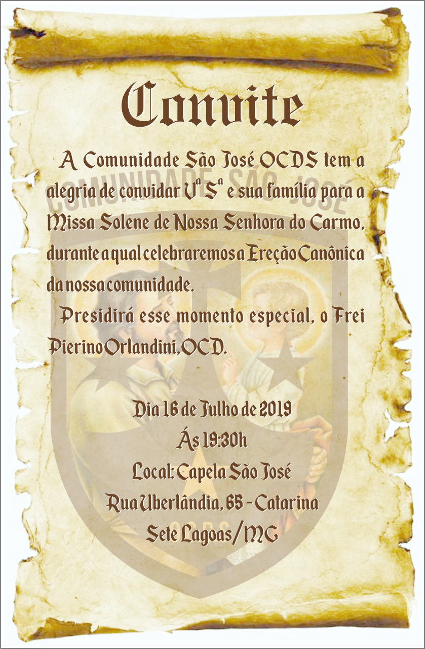 A Comunidade São João da Cruz de São Luís do Maranhão tem a imensa alegria de convidá-los para a Santa Missa, na qual membros da comunidade serão admitidos ao período formativo com a imposição do Escapulário e farão promessas temporárias.