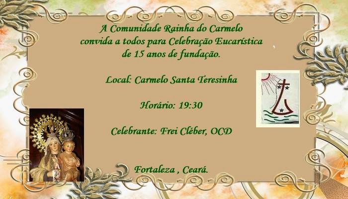 Hoje a Comunidade Rainha do Carmelo, de Fortaleza, Ceará, comemora seus quinze anos de existência, com uma Santa Missa que será celebrada na capela do mosteiro das monjas carmelitas descalças (Carmelo Santa Teresinha) às 19:30, tendo como presidente da celebração nosso estimado Padre Provincial, Frei Cléber da Trindade, ocd.
