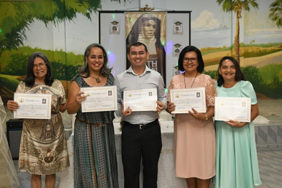 Na oportunidade, celebramos a formatura de cinco alunos: João Paulo, da Comunidade Flor do Carmelo de Santa Teresinha (Fortaleza), Mônica Mota, da Comunidade Rainha do Carmelo (Fortaleza), Vanalúcia Dias, do Grupo Nossa Senhora do Sorriso (Natal), Bernadete Álvares, da Comunidade Santa Teresa dos Andes (Belém) e Sue Luzia, de Ipatinga.