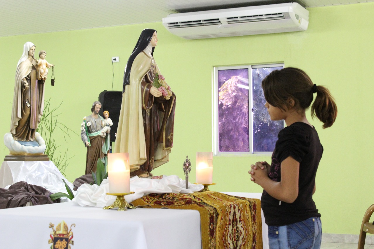 Menina paroquiana reza devotamente perante a relíquia de Santa Teresinha