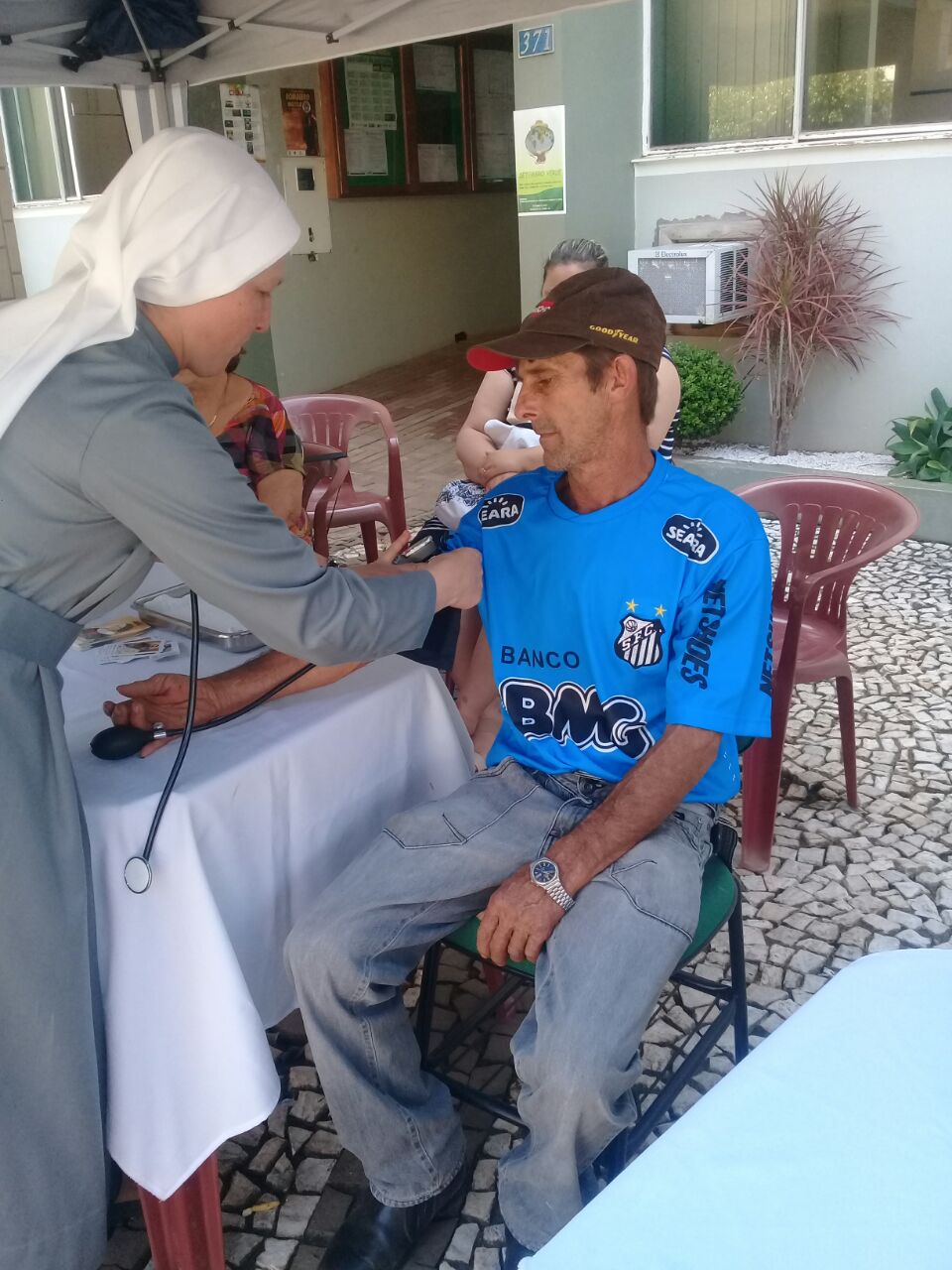 com aferição de pressão arterial, massagem, alongamento e conversa amiga com as