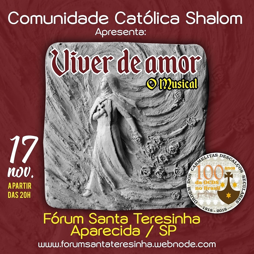 O musical “VIVER DE AMOR” será apresentado pela Comunidade Católica Shalom no Fórum Santa Teresinha, que se realizará de 15 a 18/11/2018 no Centro de Eventos Pe. Victor Coelho em Aparecida-SP.