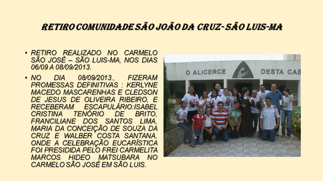 OCDS Notícias da Comunidade São João da Cruz – São Luis-MA 23/12/2013 by ocdsadm 0 comments Share: Share on:
