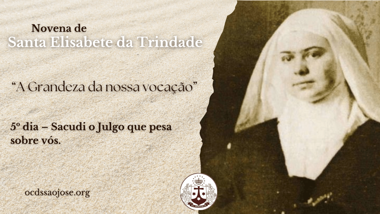 Nossa reflexão para este quinto dia da novena a Santa Elisabete da Trindade inspira-se na essência da vocação carmelitana e cristã, que é o encontro íntimo e transformador com Deus. A exortação da Santa, “Sacudi esse jugo que pesa sobre vós” é um convite à liberdade do espírito. Ela nos lembra, como carmelitas descalços, que a nossa verdadeira dignidade não está nas “futilidades”, mas em vivermos em um “ambiente em que se respira ar divino”, ou seja, no interior da nossa alma onde a Santíssima Trindade habita. A grandeza da nossa vocação reside em sermos “Louvor de Glória” de Deus, desprendidos do apego a nós mesmos e às vaidades, para nos centrarmos N’Ele – o Amigo que “está postado à porta do coração… e espera”.