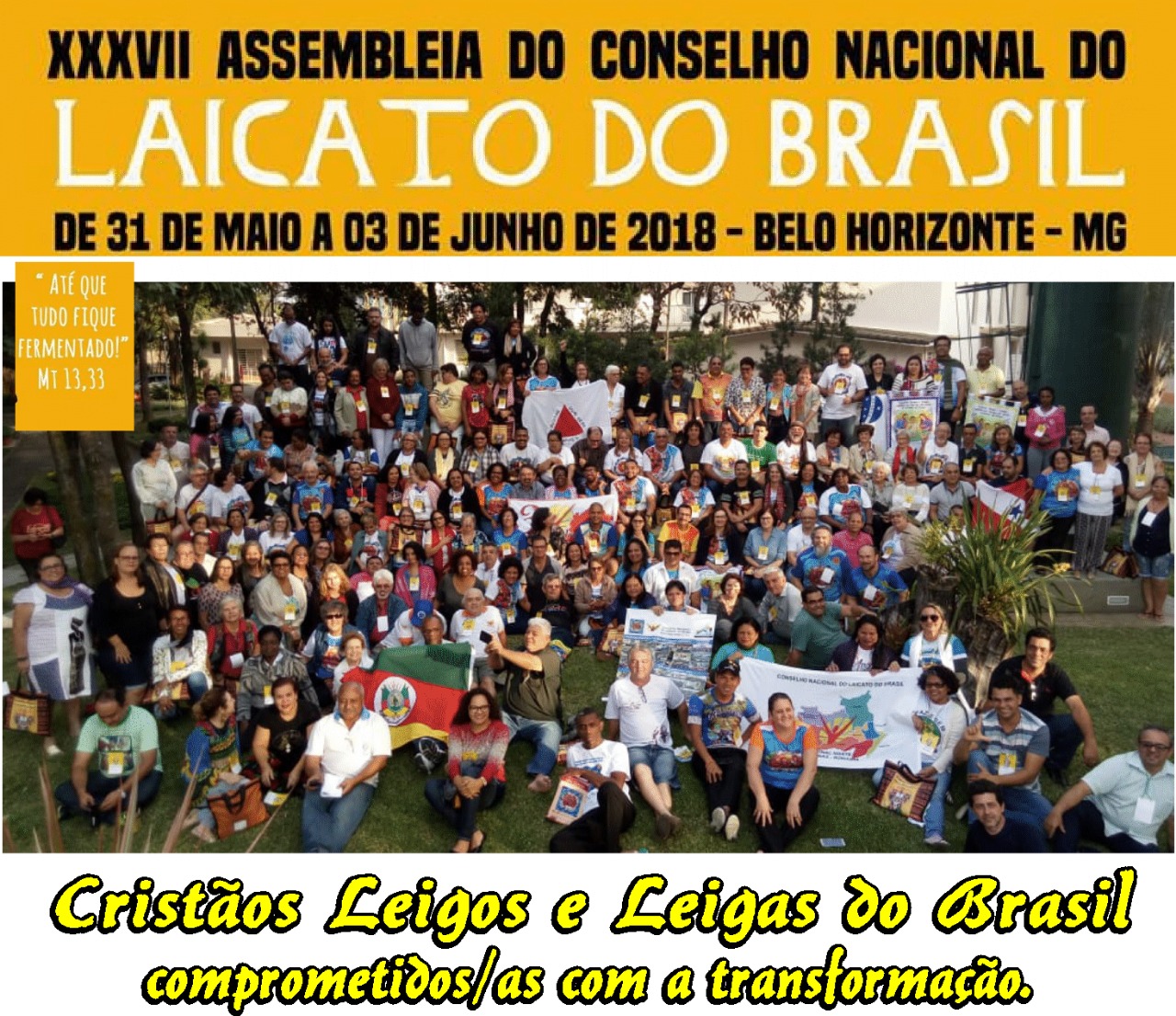 Aconteceu de 31/01 a 03/06/ppp, em Belo Horizonte-MG, a XXXVII ASSEMBLEIA DO CONSELHO NACIONAL DO LAICATO DO BRASIL, com o tema: “Cristãos Leigos e Leigas comprometidos/as com a transformação” e lema: “Até que tudo fique fermentado” (Mt 13. 33).