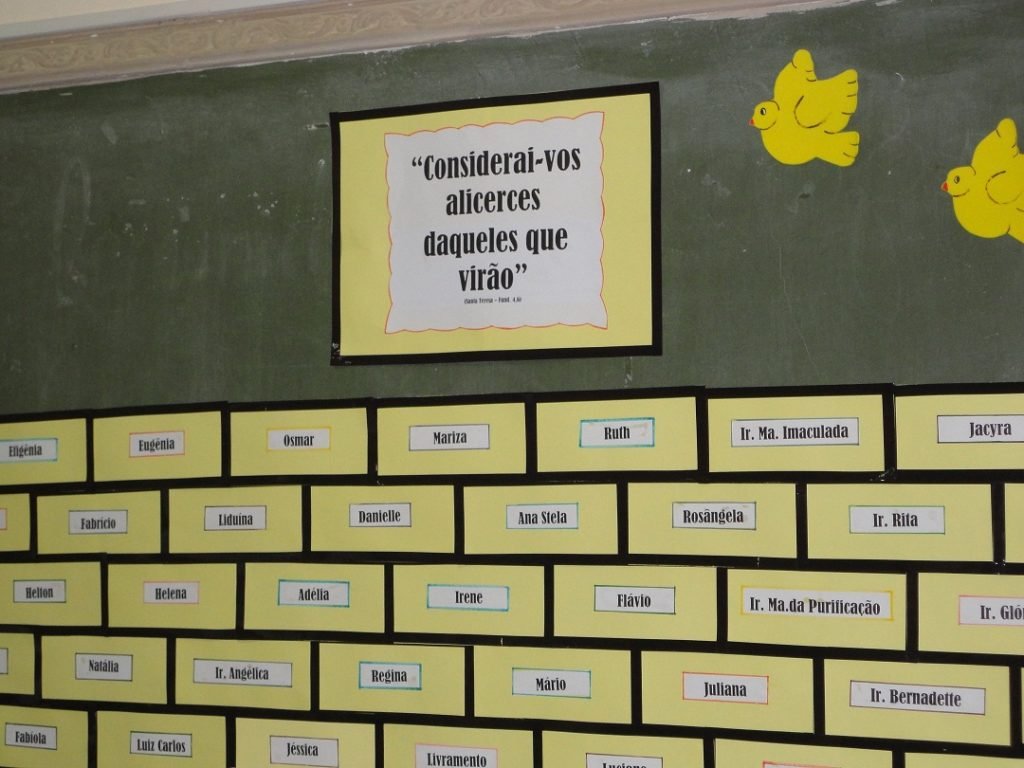 A Comunidade Rainha do Carmelo preparou um bonito painel em forma de alicerce, onde cada membro das comunidades OCDS, bem como cada monja tinha seu nome escrito em um tijolo, fazendo-nos lembrar que todos nós somos pedras vivas na construção do Carmelo. As palavras de Santa Teresa nos chamam à responsabilidade de estarmos bem preparados, principalmente a nível de formação, para que o alicerce fique bem forte para receber os tijolos que virão depois de nós.