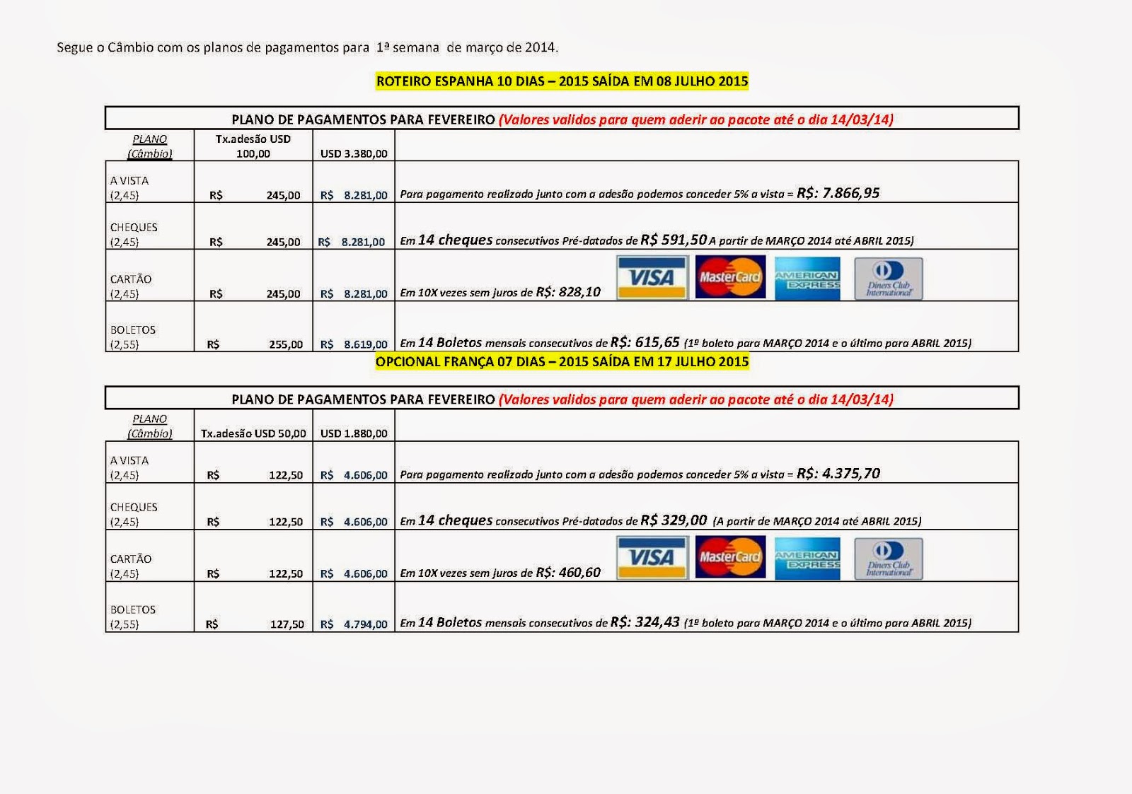 PEREGRINAÇÃO DA OCDS – PLANO DE PAGAMENTO PARA ESPANHA 10D E FRANÇA 07 D – VÁLIDO ATÉ 14/03/2014