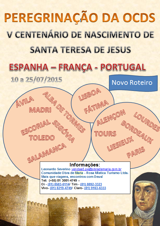 A Comunidade Obra de Maria, que está organizando a peregrinação da OCDS à Espanha e França fez algumas pequenas alterações no roteiro original e incluiu, para nossa alegria, uma visita ao Santuario de Fátima, em Portugal. Dessa forma, estamos na reta final, mas ainda há tempo para que os indecisos se resolvam nos próximos dias. Não haverá mais opcional, uma vez que todos irão à Espanha, França e Portugal.